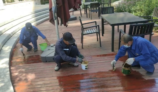 随着使用时间的推移,园区内的木质设施长期暴露在风吹、日晒、雨淋的自然环境中,部分区域出现了木材干燥、褪色、纹理开裂等现象,不仅影响了外观美观度,也降低了设施的耐用性。为解决这一问题,项目部提前制定了详细的维护方案,精心筹备。涂刷过程中,绿化班组的工作人员们分工明确、有条不紊。他们戴上手套,手持毛刷,以均匀的力度和流畅的手法,将木蜡油缓缓涂刷在木质设施上。从凉亭的立柱、横梁到座椅的扶手、椅面,再到木质地板的每一块板材,他们不放过任何一个细节,确保每一处都能被木蜡油充分覆盖。